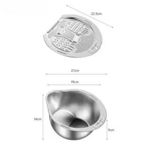 The All-in-One Stainless Steel Kitchen Drain Slicer Bowl is the ultimate kitchen companion for effortless food preparation and cleanup.