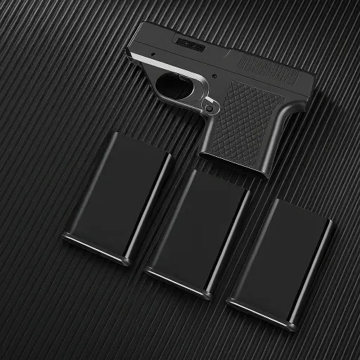 The Gun Shape Secret Storage Jet Flame Lighter is a uniquely designed metal lighter featuring a sleek lacquer finish and an innovative secret compartment disguised as the magazine.