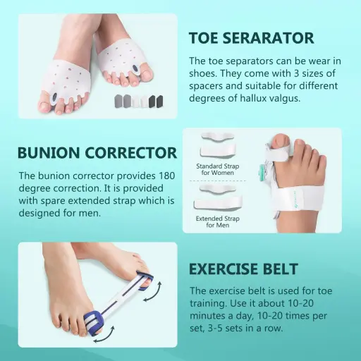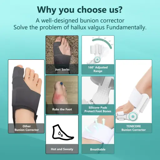TENICORE X3-Q Adjustable Knob Bunion Corrector Big Toe Straightener is a therapeutic device designed to provide relief and correct alignment for individuals suffering from bunions, hallux valgus, or general toe discomfort.